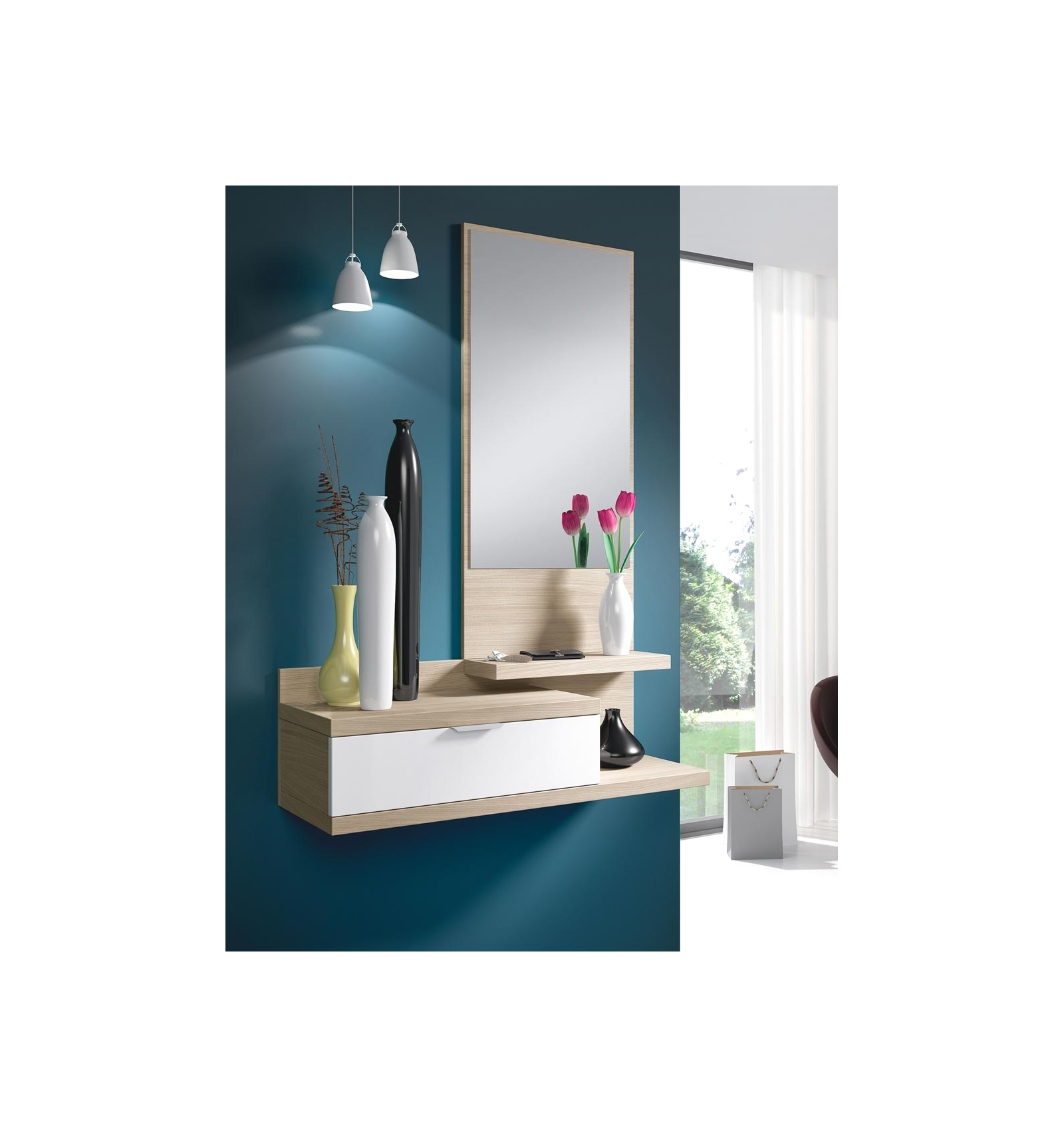 MEUBLE D’ENTRÉE COMPLET, COMPOSÉ PAR UNE PRATIQUE CONSOLE AVEC TIROIR ET GLACE. LE MEUBLE D’ENTRÉE LEDA EST SANS DOUTE IDÉAL POUR VOTRE ENTRÉE.