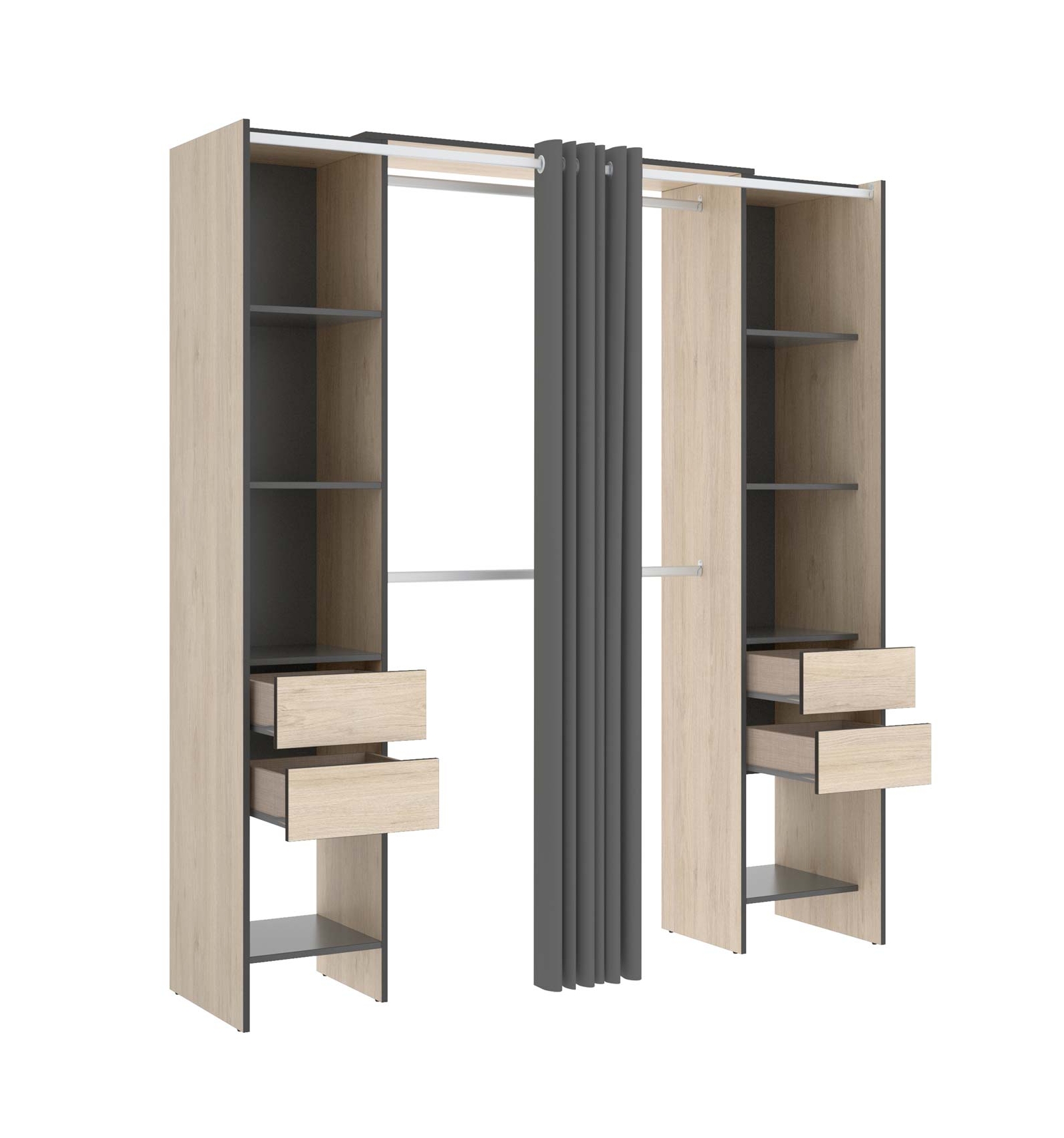 Le dressing ouvert avec tiroirs Vesto, est disponible en blanc et s'adapte à tout style décoratif ou si, au contraire, vous souhaitez donner une touche plus moderne, en couleur graphite / naturel .
